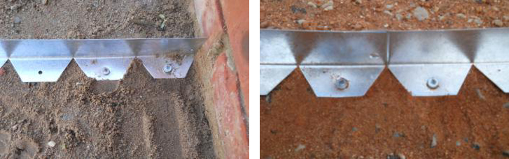 An infinite number of lengths can be joined together to serve any length of edge restraint required by simply utilising a 4.8x12mm aluminium rivet. The end joggle is to wrap around the rear of the unit following on and the rivet head is to be located on the paver side of the edge rail. Nails driven into the sub-base either side of the joint complete the jointing of the two adjacent units.