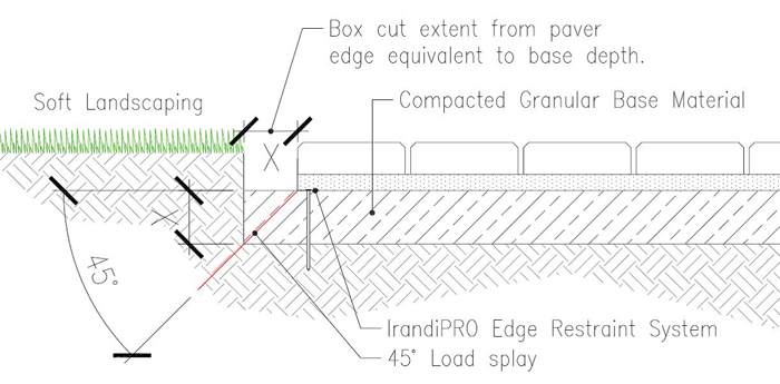 Particular care must be taken to ensure that the width of the box cut is sufficiently far from the edge of the pavers to enable an equivalent length of base material depth can be installed. This approach ensures that any load on the edge of the pavers is transmitted to the subgrade via base material.